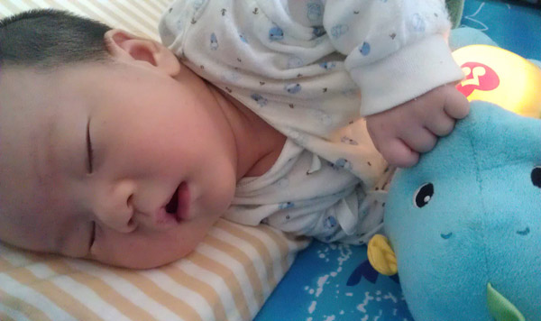 原本很容易吐奶的老二,這週不知道是不是因為天氣變化的關係,會出現「咳咳」二聲,只要一出現「咳咳」二聲時,就開始誘發他吐奶了。一吐奶就如同排山倒海之勢,讓媽媽一整天換了三套衣服還不夠,幸好還有太陽可以加速曬乾,否則baby就要沒有衣服可以換了!