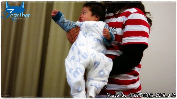 拉鍊往下拉就穿好了 非常的方便 (因為熊八才4個月 所以看起來防踢背心很大 XD)