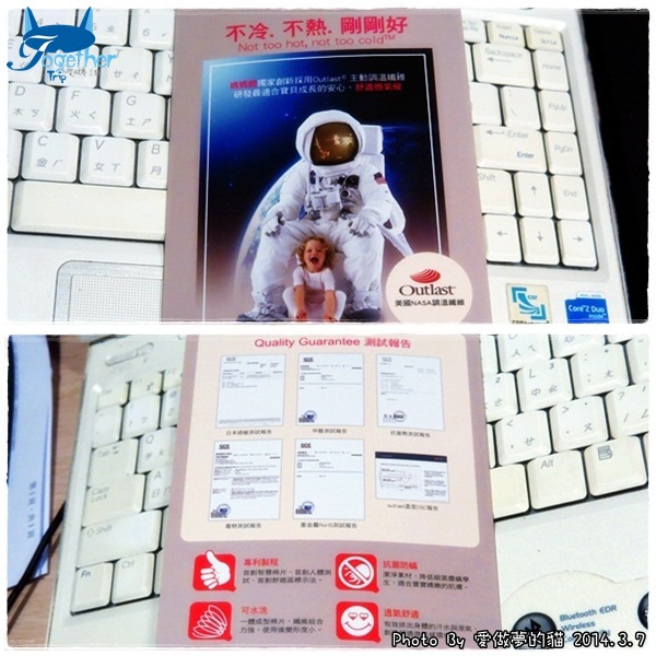 在mamaway防踢被心上的吊牌 主要就是一些所使用到的恆溫材質的品牌